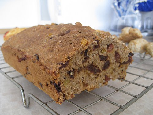 - Spoon the mixture into a 454g (1lb) lined loaf tin and bake in the preheated oven for 11/4 hours until cooked.